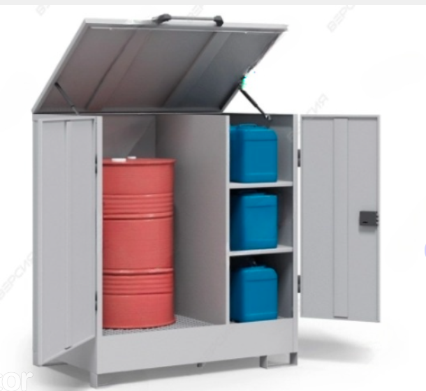 - Для случайного пролива технических жидкостей дно шкафа решетчатое с герметичным контейнером в который собирается пролившаяся жидкость с целью ее дальнейшего использования.