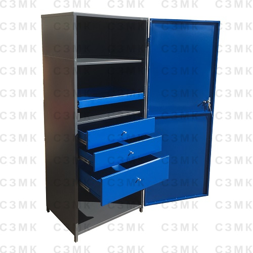 Шкаф ШИМ-02 представляет собой надежную цельносварную конструкцию, состоящую из каркаса, выполненного из стальной трубы квадратного сечения, и обшивок из листовой стали. Внутри шкафа ШИМ-02 установлены три ящика и ложемент, которые легко выдвигаются на роликовых направляющих, а также три металлические полки. Шкаф ШИМ-02 оборудован дверкой с замком и ручкой.