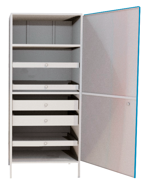 Шкаф ШИМ-11-02 представляет собой надежную цельносварную конструкцию, состоящую из каркаса, выполненного из стальной трубы квадратного сечения, и обшивок из листовой стали. Внутри шкафа ШИМ-11-02 установлены два ящика и два поддона, которые легко выдвигаются на роликовых направляющих, а также одна металлическая полка. Шкаф ШИМ-11-02 оборудован дверкой с замком и ручкой.