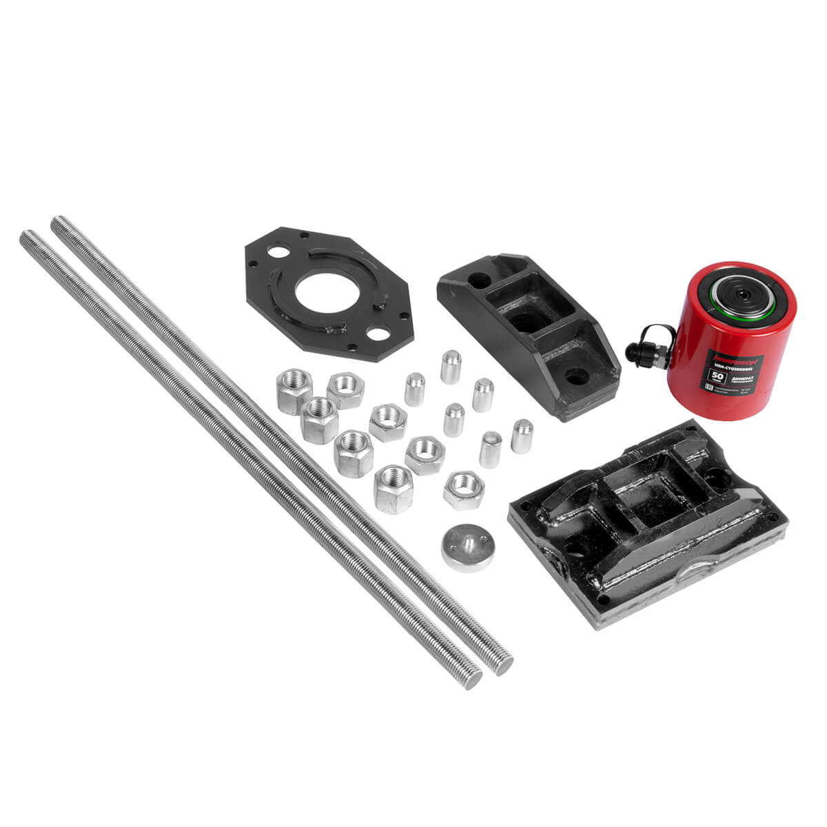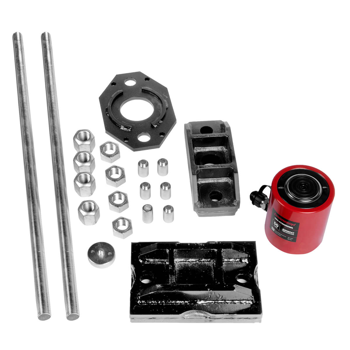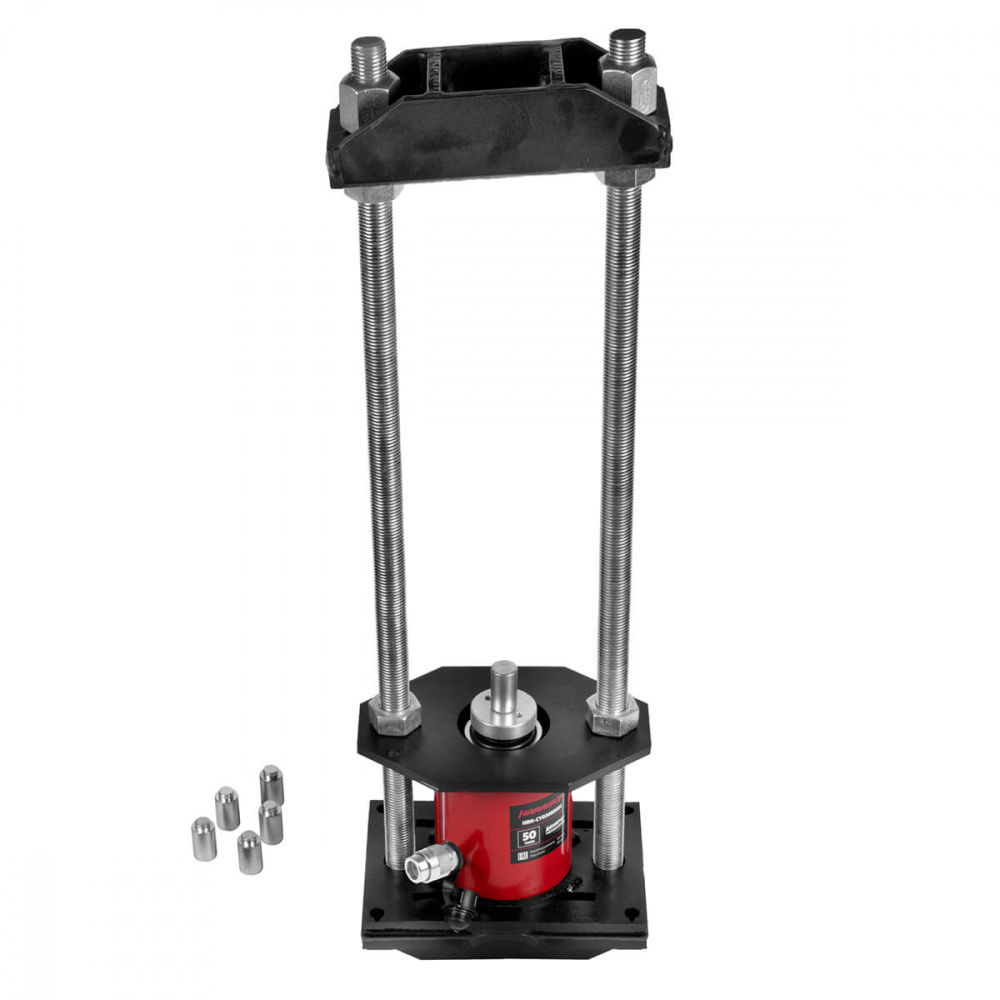 Использование данного оборудования позволяет, как выпрессовывать шкворень, вышедший из строя, так и запрессовывать новый. Так же данный комплект можно использовать для выполнения любых других подобных операций, широко распространённых при ремонте как грузовых, так и легковых автомобилей. При использовании HRH-SH050150PA выпрессовка и запрессовка шкворней становится быстрой, легкой и удобной. Пневмогидравлическая педаль в комплекте.