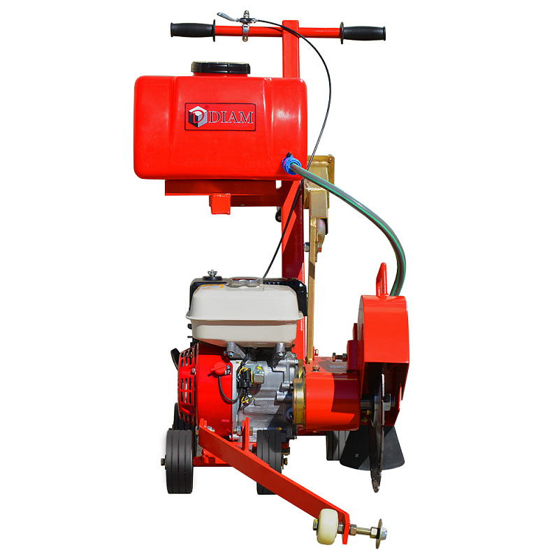 Нарезчик швов DIAM RK-350/5.5H - универсальная модель для резки швов в асфальте и железобетоне при выполнении строительных, демонтажных и ремонтных работ. Оснащен бензиновым двигателем HONDA GX-160 мощностью 5,5 л.с., максимальный диаметр алмазного диска 350 мм, глубина резки 120 мм. Регулировка глубины резки осуществляется при помощи штурвала со шкалой заглубления. Защитный кожух легко снимается, позволяя быстро и просто заменить алмазный диск. В стандартную комплектацию входит размещенный над двигателем 15-литровый водяной бак и штанга-линейка для контроля примолинейности перемещения. Усиленная стальная рама с порошковым покрытием гарантирует повышенную надежность. Тщательно продуманная конструкция обеспечивает удобство в эксплуатации. Применение дисков для сухой резки позволяет резать в сухую, что важно при минусовых температурах.