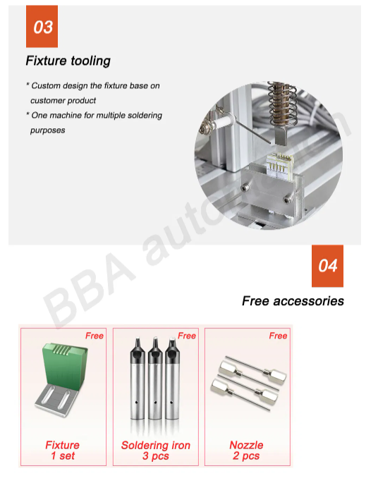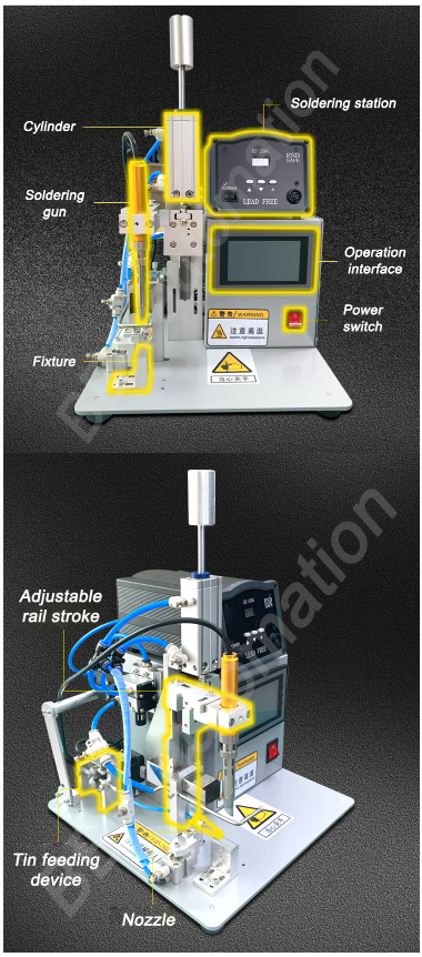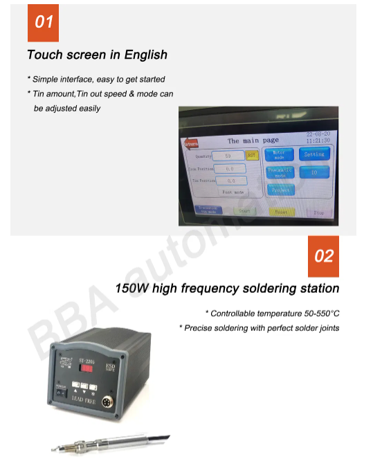 Полуавтоматический паяльный аппарат — это автоматизированное оборудование, заменяющее ручную пайку. Он отличается лёгкой конструкцией, стабильной работой и удобством обслуживания. Используется в пайке светодиодов, печатных плат и других отраслях. В электронной промышленности автоматический паяльный аппарат применяется для пайки печатных плат смешанного типа, термочувствительных и чувствительных компонентов в процессе поверхностного монтажа (SMT). Аппарат для коаксиальной пайки оснащен ПЛК с сенсорным экраном, высокоточным регулятором температуры и функцией продувки оловянным шлаком. Не требует специальных знаний в области пайки, с ним легко справятся даже новички.