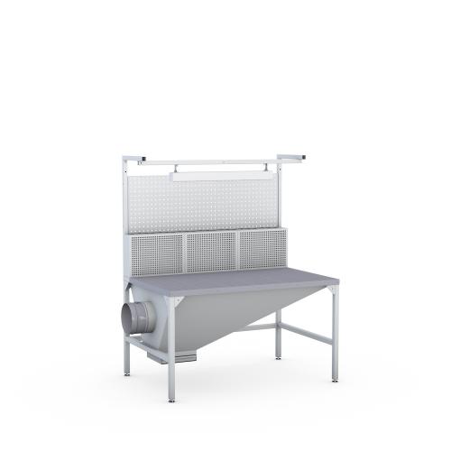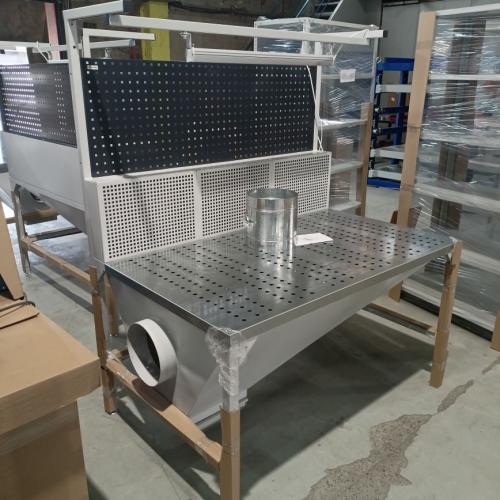 Конструкция шлифовально-зачистного стола предусматривает эффективное выведение образующихся в процессе работ пылевых смесей и твёрдых частиц, образуемых при работе с абразивами. Для этого в конструкции стола предусмотрены фронтальная перфорированная вытяжная панель и столешница.. Каркас сварной, столешница из оцинкованного перфорированного листа толщиной 2 мм. Вытяжное устройство регулируется дроссель-клапаном с ручным управлением. Стол оборудован светодиодным светильником на стойках и перфорированным экраном. На дне вытяжки установлен выдвижной лоток для сбора пыли. Ножки стола на регулируемых опорах.