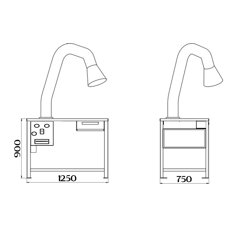 Справа под столешницей расположена тумба с полками для размещения инструмента и оснастки. Дверка тумбы оборудована замком и ручкой. Удаление вредных веществ, образующихся при сварке, осуществляться с помощью подъемно-вытяжного устройства, соединенного с вентилятором.
