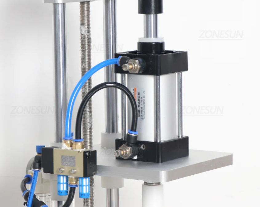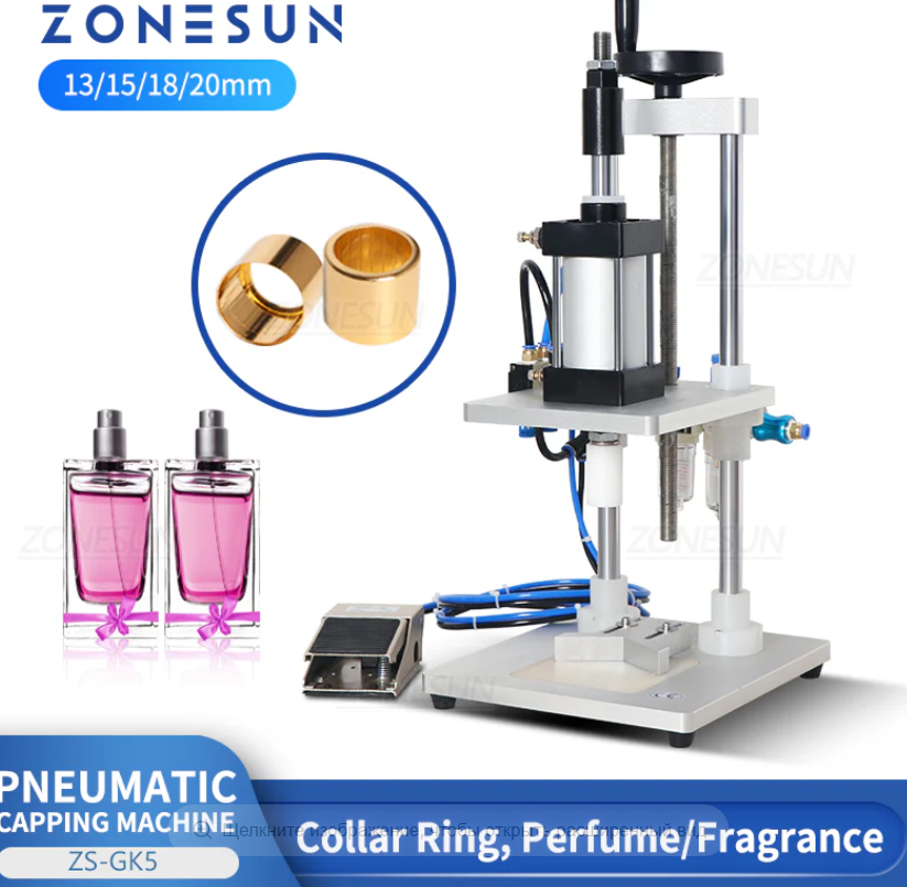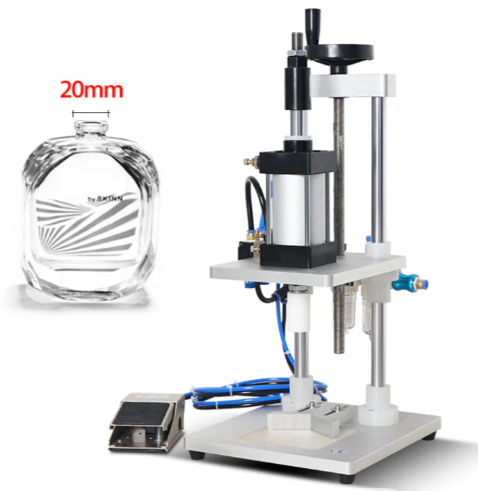 Эта машина предназначена для укупорки флаконов с духами с помощью горлышка. Пневматическая укупорочная машина обладает большей мощностью и позволяет укупоривать флаконы быстрее, чем ручная. Машина подходит для флаконов диаметром 13/15/18/20 мм