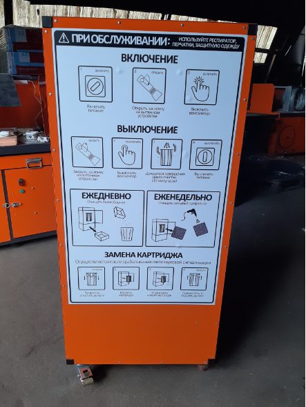 При падении давления в системе, встроенный компрессор включается автоматически. Управление соленоидными клапанами может осуществляться как в ручном, так и в автоматическом режиме, по желанию Заказчика. В нижней части устройства находится вентилятор, который создает разряжение необходимое для работы оборудования. По желанию Заказчика в цепь питания вентилятора может быть установлен частотный преобразователь, с помощью которого меняются обороты вентилятора и, соответственно, производительность всей системы. Преимущество этой опции в том, что при уменьшении числа оборотов вентилятора, уменьшается уровень шума, а производительность установки такова, что ее далеко не всегда нужно включать на полную мощность. Корпус фильтровентиляционной установки, для удобства ее перемещения, оборудован четырьмя колесными опорами.