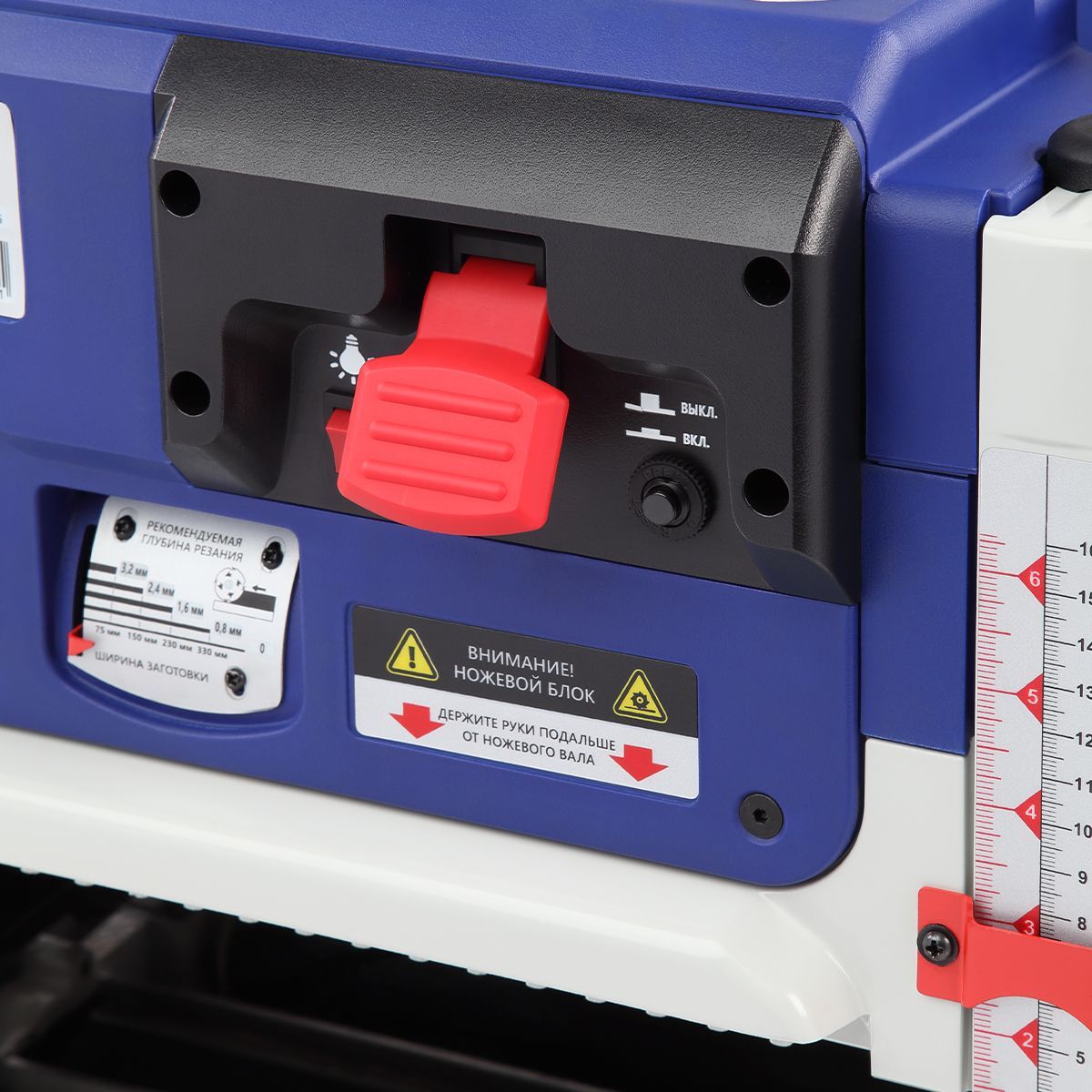 Регулировка высоты рабочей платформы осуществляется поворотом маховика с диапазоном от 5 до 152 мм. Для точной настройки предусмотрена шкала глубины строгания и ограничитель высоты с фиксацией на 5, 10, 18, 20, 25 и 30 мм. Это позволяет быстро устанавливать нужную толщину обработки и повторять параметры для серийных деталей.