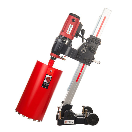 Установка алмазного бурения DIAM CSN-355A - профессиональная двухскоростная алмазная сверлильная установка с наклонной стойкой в комплекте. Применяется для сверления отверстий алмазными коронками в бетоне, железобетоне, камне и кирпиче. Диаметр сверления от 25 до 355 мм. Мощность электромотора 2,7 кВт, напряжение 220 В. Угол наклона стойки от 30 до 150 градусов. Длина стойки 1000 мм, рабочий ход каретки 550 мм. Вал имеет стандартный хвостовик для крепления алмазной коронки 1 ¼”. Оснащена системой подачи воды, защитой от перегрузки и перегрева, электрической защитой оператора от удара электротоком PRCD.