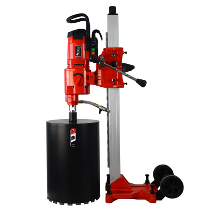 Установка алмазного бурения DIAM ML-350/2NE - мощная двухскоростная алмазная сверлильная установка с алюминиевой стойкой в комплекте. Применяется для сверления отверстий алмазными коронками в бетоне, железобетоне, камне и кирпиче. Диаметр сверления от 20 до 350 мм. Мощность электромотора 4,88 кВт, напряжение 220 В. Длина стойки 1000 мм, рабочий ход каретки 600 мм. Без наклона. Вал имеет стандартный хвостовик для крепления алмазной коронки ½ и 1 ¼”. Оснащена системой подачи воды, защитой от перегрузки, электрической защитой оператора от удара электротоком PRCD. Машина так же снабжена электронной регулировкой оборотов и мощности, что помогает подобрать оптимальные обороты сверления и позволяет снизить пусковую нагрузку (мягкий старт).
