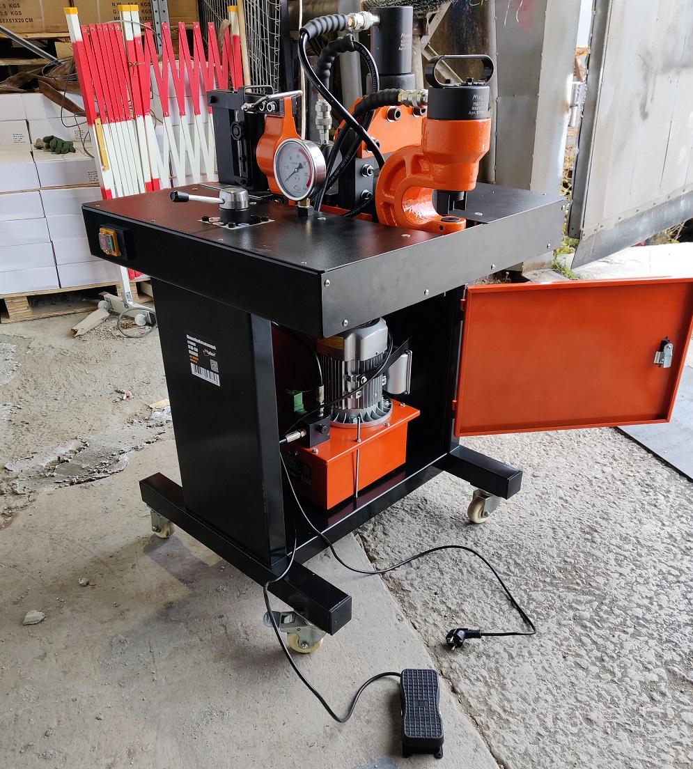 Станок оснащен всеми необходимыми приспособлениями для оперативной обработки электротехнических шин: в его состав входят шиногиб, шинорез и шинодыр, которые закреплены на передвижном столе и проводятся в действие электрогидравлической насосной станцией (входит в комплект поставки), которая подключается к сети переменного тока 220В. Шланги высокого давления соединяют электрогидравлическую насосную станцию с шинообрабатывающими инструментами через гидравлический переключатель.