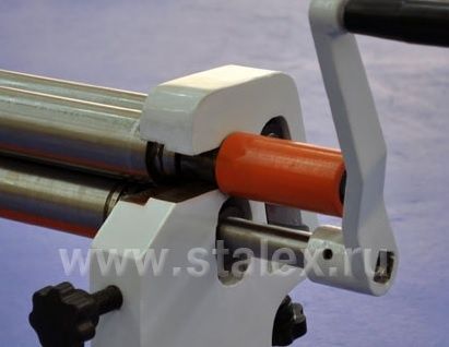 STALEX W01 не повредит обрабатываемый лист благодаря гладким полированным вальцам, имеющим отверстия для прутков. Снимать готовую деталь легко при помощи специального откидного механизма на верхнем вальце и быстросъемного зажима. Вращение вальцов осуществляется за счет зубчатой передачи. Нижний вал можно регулировать – на нем установлен кулачковый упор.