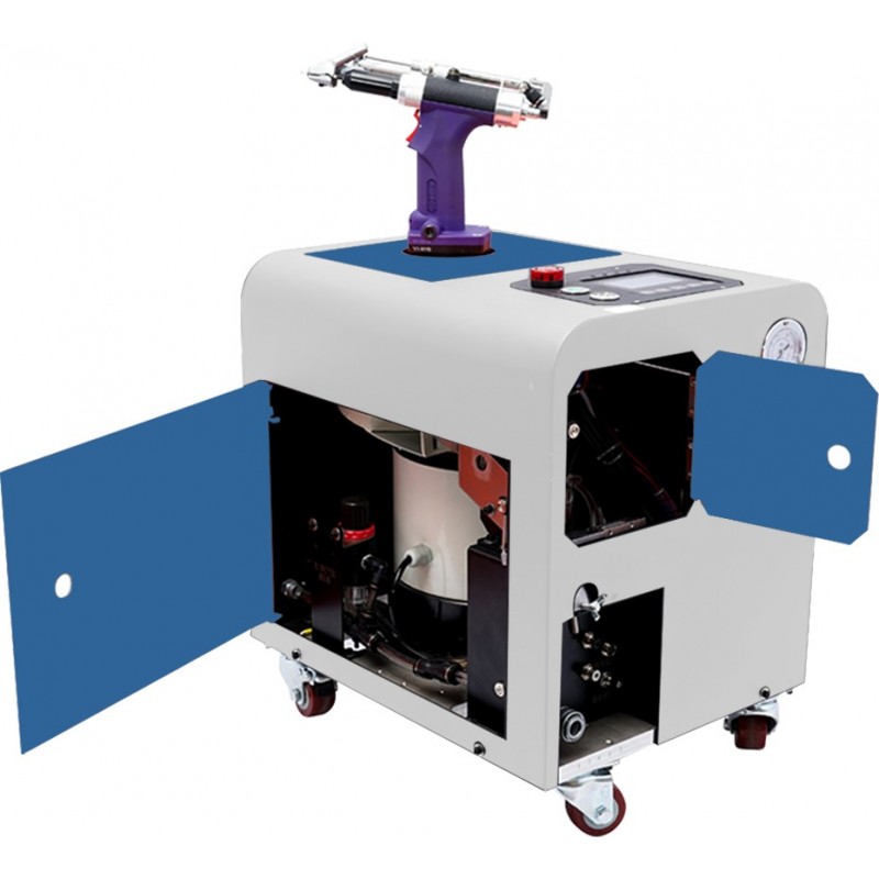 Данная станция оснащена автоподачей заклепки в инструмент, а так же последующим перемещением оторванного стержня в специальный резервуар.