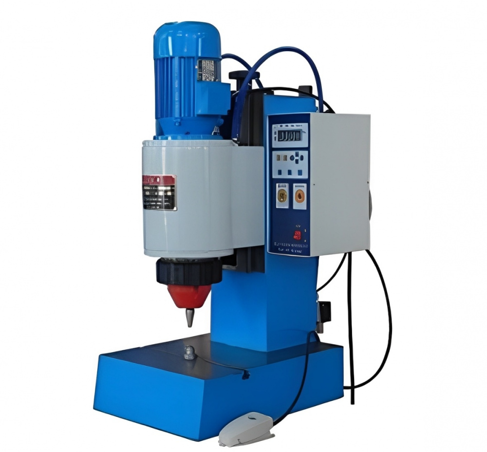 Модель JM9TQ – это небольшой настольный пневматический клепальный станок радиальной конструкции. Головка станка регулируется вверх и вниз для адаптации к различным формам и размерам заготовок. Пневматическая система оснащена системой аэрозольной смазки и двухпозиционным регулятором для эффективного управления скоростью хода поршня. Электрическая система управления оснащена счётчиком и реле времени для простоты и удобства эксплуатации. На рабочем столе имеется Т-образный паз для крепления зажимного устройства, а позиционирующее отверстие соосно шпинделю обеспечивает точность клепки ±0,05 мм.