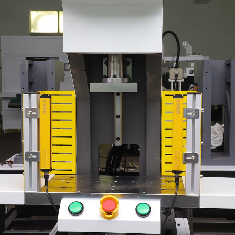 7. Большинство неисправностей, возникающих во время работы оборудования, отображаются на сенсорном экране, что позволяет производственному персоналу быстро устранять проблемы и восстанавливать производство на месте. 8. Оборудование использует защитную световую завесу для запуска и остановки. Оно останавливается, когда оператор засовывает руку внутрь, чтобы выпустить материал, и снова запускается, когда он вынимает руку, обеспечивая безопасность оператора.