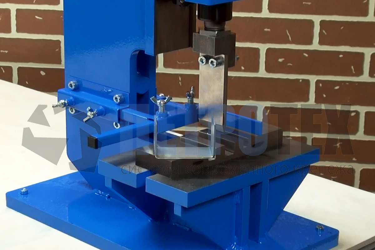 Пресс ручной представляет собой оборудование, состоящее из станины пресса и стойки. В стойке устанавливается колонка, усилие на которую передается через коленно-рычажную передачу от рычага. Регулировка высоты рабочей зоны выполняется с помощью регулировочного болта. Благодаря жесткому съемнику, металл снимается с пуансона при обратном движении колонки. Пуансон и матрицу при необходимости можно заменить на аналогичные/требуемые размеры. Отход через матрицу на провал попадает в лоток для отходов, который в случае заполнения можно извлечь и освободить от отхода. Для удобства работы на прессе предусмотрена система регулируемых упоров.