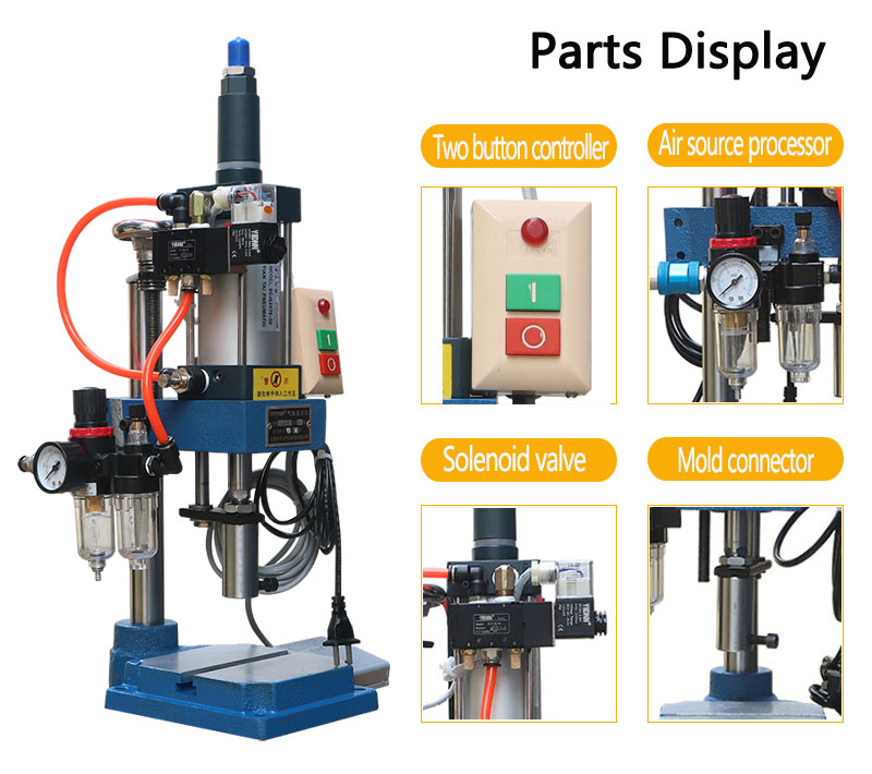 Пресс управляется двумя кнопками одновременно. Пневматический пуансон работает на сжатом воздухе, с низким уровнем шума, без загрязнения окружающей среды.