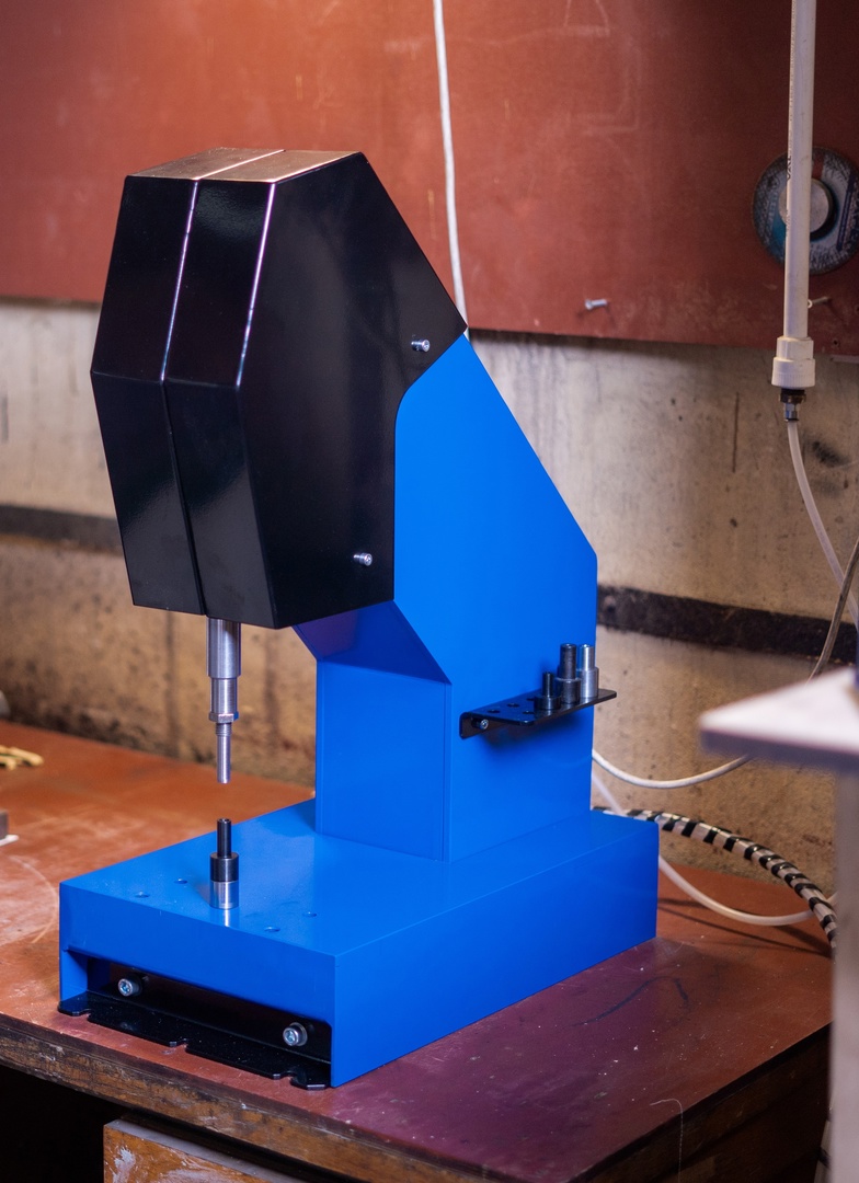 Конструкция из жесткой сборно-сварной станины крепится на столе. В верхней части станины – механизм. С помощью пневмопривода создает и передает через шток вертикальное усилие на рабочий инструмент. Благодаря механизму с регулировкой направление движения штока выставляется без погрешности.