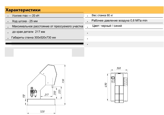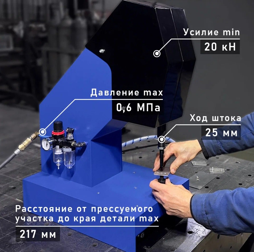 Применение пневмопривода позволило вдвое увеличить усилие запрессовки и механизировать процесс. Управление от педали освобождает руки оператора и делает работу удобной и комфортной. Исполнение настольное. Для работы необходима пневматическая магистраль с давлением не менее 0,6 мПа.