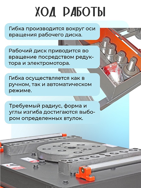 Гибка производится вокруг оси вращения рабочего диска. Рабочий диск приводится во вращение посредством редуктора и электромотора. Гибка осуществляется только в ручном режиме. Требуемый радиус, форма и углы изгиба достигаются выбором определенных втулок.