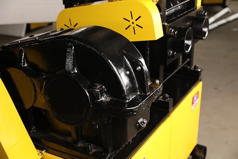 Выпрямляющая машина для арматуры собран, как передвижная в пределах объекта работ металлическая тумба на колесах, на базе которой работает специальное оборудование. В полости тумбы установлен электродвигатель, от которого передается крутящий момент на редуктор. От последнего усиленная энергия передается на нижний рабочий вал, который находится в зацеплении с верхним рабочим валом. Оба вала имеют сопряженные канавки различного размера, подходящие для разных диаметров арматуры. Арматура вводится между валами через подающие патрубки с конусами в оконечностях, для удобства помеченные цифрами – соответствие диаметру.