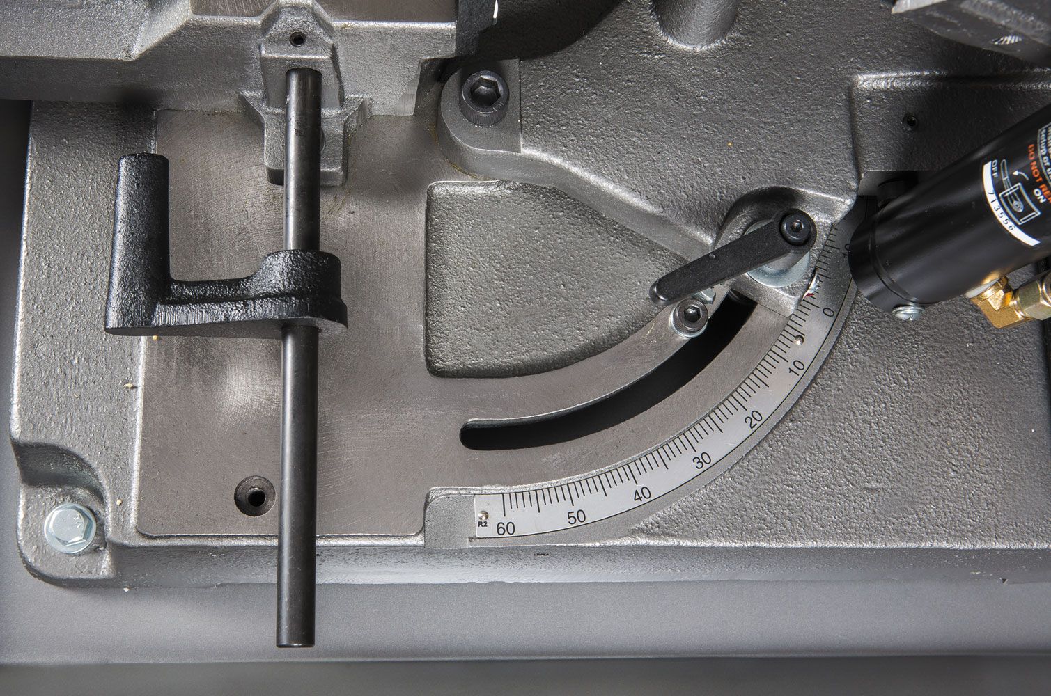 Модель MBS-56CS представляет собой ленточнопильный станок, рассчитанный на массовое серийное производство, используемый в домашних условиях для индивидуальной работы. Конструкция станка выполнена по европейскому типу, с поворотной рамой. Поворот рамы в нужное положение осуществляется при помощи шкалы, в диапазоне -45 0 – 60 0 . Для удобства работы в конструкции станка предусмотрено установка тисков в двух положениях. Основная особенность этой модели - наличие системы гидроразгрузки, обеспечивающей плавность и легкость опускания и подымания консоли. С помощью гидроцилиндра регулируется прижимное усилие пильной рамы, скорость подачи рамы на обрабатываемую заготовку. Модель предназначена для распила круглых заготовок максимальным диаметром 125 мм.