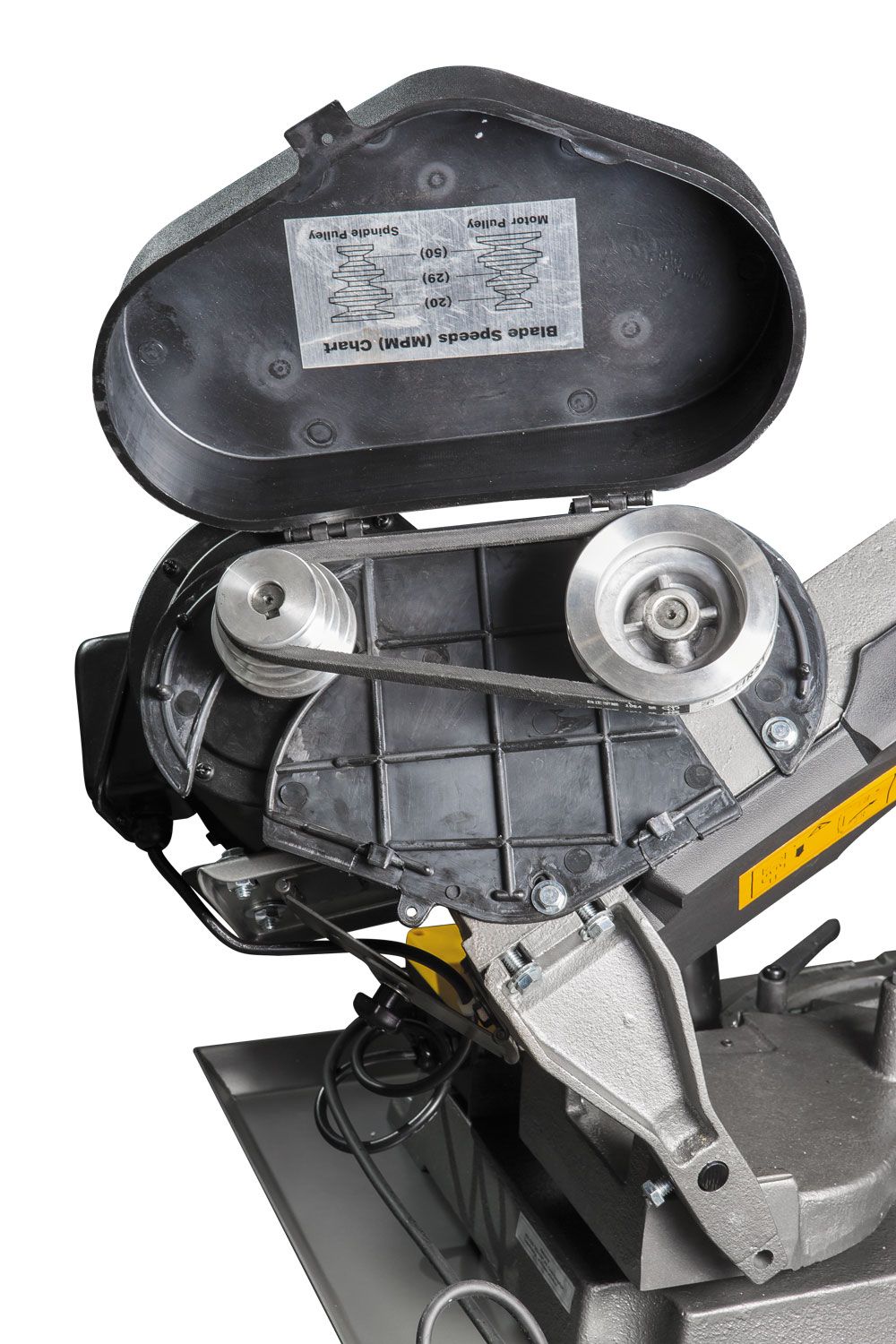 Модель оснащена электродвигателем, мощность которого составляет 0,35 кВт. Ременная передача позволяет использовать в процессе работы три скорости движения ленточного полотна, 20,30 и 50 м/мин. Регулировка хода полотна осуществляется путем поворота двух винтов, расположенных в левой части пильной рамы. Натяжение пилы выполняется в ручном режиме, используя для этой цели маховик, установленный слева, в торцевой части консоли.