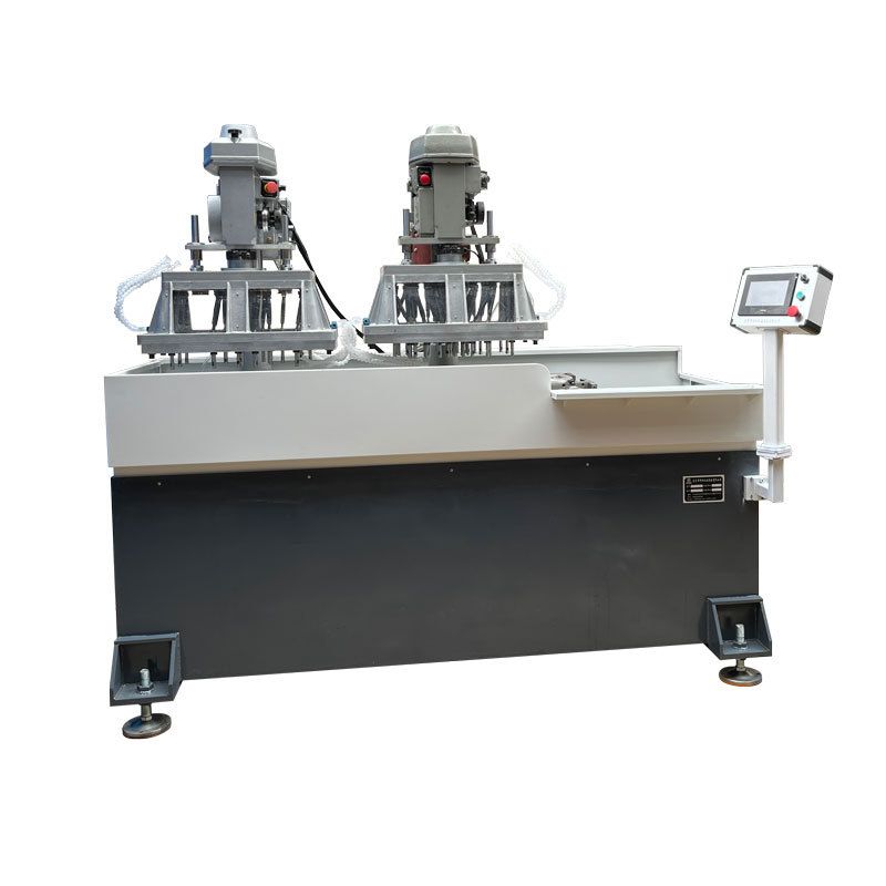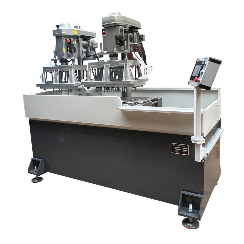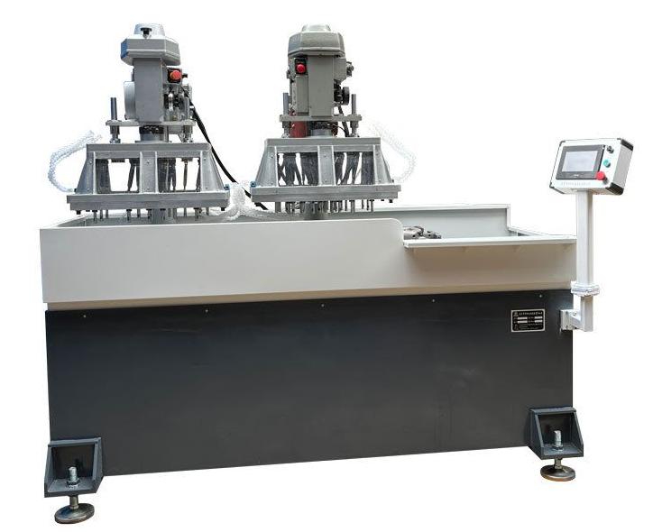 Это многоосевой автоматический резьбонарезной станок с сервоприводным перемещением стола. В станке используются две многоосевые головки 651 6 с вставными пластинами размером 300*500 мм. Для двух разных шагов резьбы, где невозможно одновременно перемещать отверстия, используются два основных блока и два комплекта многоосевых головок. Многоосевые головки с вставными пластинами являются съемными и многоразовыми, что позволяет одновременно нарезать резьбу с разным шагом.