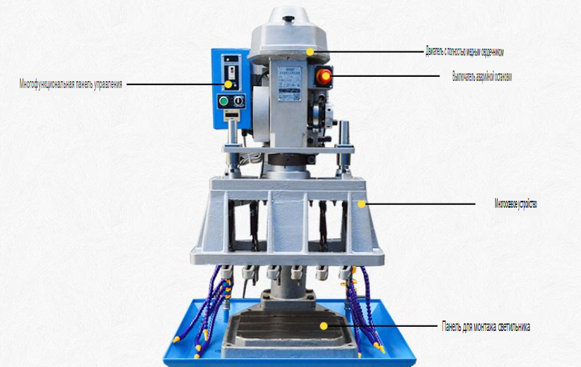 - Удобное управление: Полуавтоматический цикл работы. Панель управления включает счётчик циклов, регулятор глубины, переключатель режимов (одиночный/автоматический цикл) и аварийную кнопку остановки.