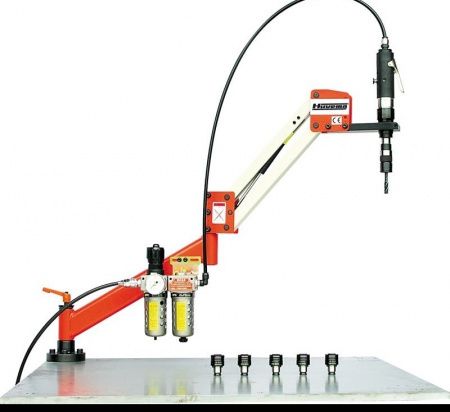 Пневматический резьбонарезной манипулятор AQ-08-950 предназначен для нарезания резьбы метчиками М2-М8; Два плеча и пневмопривод закреплены таким образом, что при движении резьбонарезной шпиндель всегда остается в одном и том же положении относительно поверхности стола, тем самым обеспечивается постоянство угла нарезания резьбы; Работа с более тяжелым материалом не требует дополнительного оборудования или перемещения на более просторное рабочее место; Низкий процент поломок, высокая точность нарезания резьбы; Станок имеет функцию реверс.