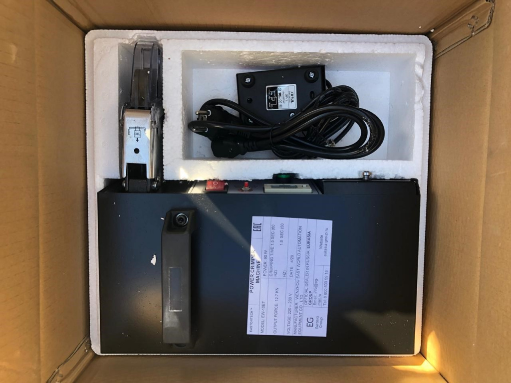 Электрическая обжимная машина EM-6B2 внешне представляет собой ящик прямоугольной формы в металлическом корпусе с вентиляционными отверстиями. На верхней плоскости корпуса имеется ручка, необходимая для удобства ношения изделия. На левой торцевой стенке имеется два провода, один из которых для включения прибора в сеть, второй – для соединения с ножной педалью замыкания контактов. На фронтальной панели устройства справа смонтирован исполнительный инструмент, который представляет собой малогабаритный пресс в виде неких вертикальных пассатижей. Нижняя часть пресса фиксированная, верхняя – подвижная. С целью возможности обжимать клеммы различного назначения и, соответственно, конфигурации, оборудование оснащается набором пресс-форм. Матрица, состоящая из двух элементов, вставляется в подвижную и фиксированную части пресса, крепление осуществляется с помощью винтов. Внешняя часть пресса, с целью соблюдения мер безопасности, частично закрыта прозрачным кожухом из прочного полимерного материала. Подсчёт количества обжимов производится на цифровом счётчике.