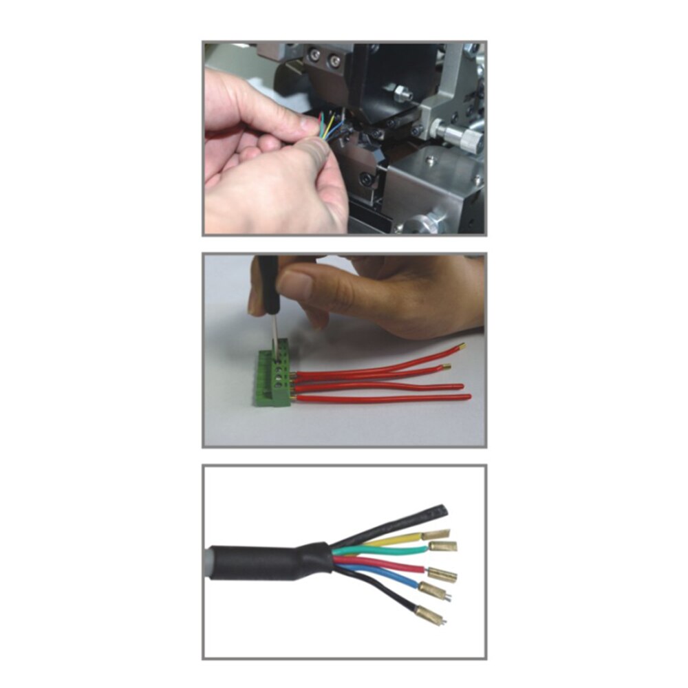 Станок EW-1565 полностью автоматизирован, что значительно ускоряет работу для оператора. Принцип действия станка достаточно прост – оператор подготавливает конец провода, вводит необходимые настройки в агрегат и затем располагает кабель в специальном держателе. После запуска станок срезает необходимую часть изоляции, обнажая проводник, а обжимной аппликатор оснащает его клеммой под высоким давлением специализированного пресса. Длину зачистки и силу обжима можно свободно регулировать в зависимости от типа кабеля и его особенностей.