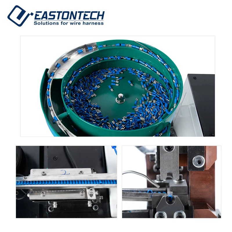 Этот станок представляет из себя пресс с усилием 2 тонны, с вибропитателем для обжима клемм. Станок может использоваться в качестве обжимного станка 2,0 т с боковой и задней подачей. Разница между станками EW-5055 и EW-5055-1 в том, что EW-5055 не зачищает провод, а EW-5055-1 – обладает функцией предварительной зачисткой провода (2 в 1)