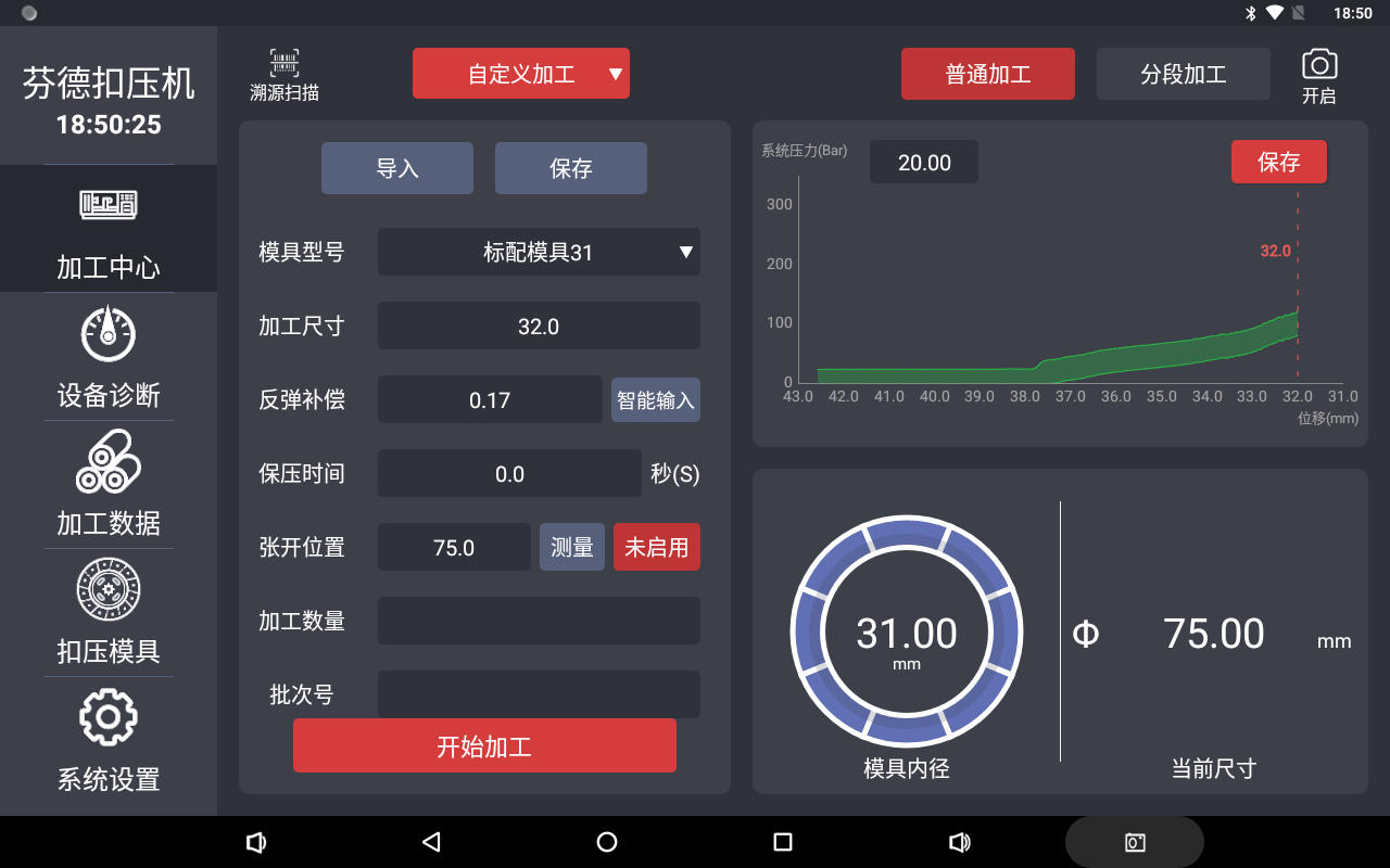 Характеристики интеллектуального обжимного станка: 1. Доступны несколько режимов обработки: ручной, автоматический и настраиваемый. 2. Три интеллектуальных метода обжима (одновременный контроль размера, давления и силы). 3. Мониторинг и загрузка данных обработки в режиме реального времени для удобного последующего управления и отслеживания качества труб. 4. Интеллектуальная настройка компенсации отскока во время обжима. 5. Дистанционное управление обжимным оборудованием. 6. Интеллектуальное цифровое подключение штангенциркуля для автоматического расчета компенсации для исправления ошибок обработки. 7. Автоматическое определение полного обжима соединителя. 8. Интеллектуальное распознавание данных для предотвращения неправильного ввода. 9. Нет необходимости вручную вводить соответствующие параметры обжима. 10. Устройство самодиагностики с сигнализацией неисправностей.