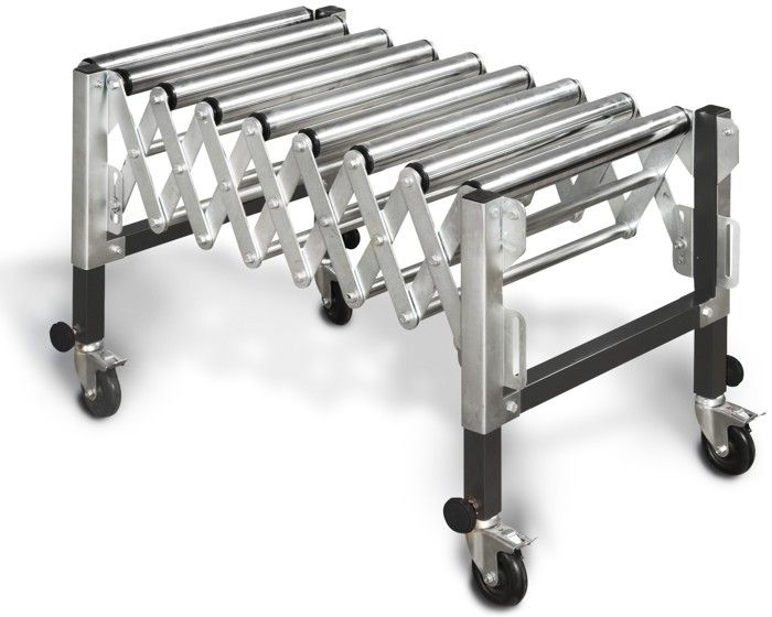 - Раздвижной рольганг с регулируемой длиной и высотой для поддержки длинных заготовок, отличается большой мобильностью благодаря четырём вращающимся рулевым колесам со стояночным тормозом на каждом.