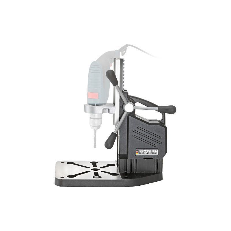 BDS ZBS-100.2 — промышленная сверлильная стойка для стандартных ручных дрелей с диаметром зажимной шейки 43 мм. Безопасность и устойчивость обеспечивается благодаря чугунной опорной плите и салазкам с рабочим ходом 180 мм.
